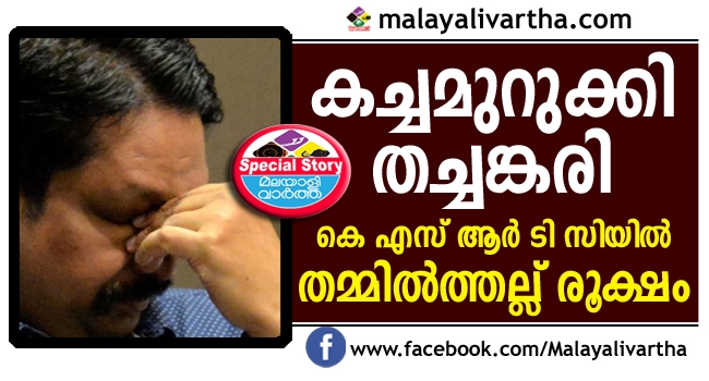 കെഎസ്ആർടിസിയിൽ ശമ്പളം കൊടുക്കാൻ അനുവദിച്ച തുക വകമാറ്റിയ ഗതാഗത സെക്രട്ടറിക്കെതിരെ എം.ഡി.ടോമിൻ തച്ചങ്കരി. ഇതുമായി ബന്ധത്തപ്പെട്ട് മുഖ്യമന്ത്രിക്കും ധനമന്ത്രിക്കും തച്ചങ്കരി പരാതി നൽകി. അനുവദിച്ച തുക കെടിഡിഎഫ്സിക്ക് പലിശ നൽകാൻ നീക്കിവച്ചു കൊണ്ട് കെ.ആർ.ജ്യോതിലാൽ ഇറക്കിയ ഉത്തരവാണ് വിവാദമായത്. ശമ്പളം നൽകാൻ അനുവദിച്ച പണം വകമാറ്റിയ ജ്യോതിലാലിന്റേത് തൊഴിലാളികളെ വഞ്ചിക്കുന്ന നിലപാടാണന്നും നിയമവിരുദ്ധമാണെന്നും ചൂണ്ടിക്കാണിച്ചാണ് കത്ത്.