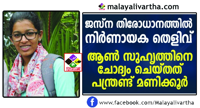 ജസ്ന തിരോധാനവുമായി ബന്ധപ്പെട്ട അന്വേഷണം അതിന്റെ അവസാന ഘട്ടത്തിലേക്ക് നീങ്ങുന്നു എന്ന് സൂചന. ജസ്നയുടെ സുഹൃത്തിനെ അന്വേഷണ സംഘം പന്ത്രണ്ട് മണിക്കൂർ ചോദ്യം ചെയ്തു. ജസ്നയുമായി അടുപ്പമുണ്ടെന്ന് വിശ്വസിക്കുന്ന ഇയാളിൽ നിന്ന് നിർണായകമായ പല വിവരങ്ങളും ലഭിച്ചതായി സൂചനയുണ്ട്.