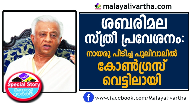 അങ്ങനെ ശബരിമലയിലെ സ്ത്രീ പ്രവേശന വിവാദത്തിൽ കോൺഗ്രസും കക്ഷിയായി.മൻമോഹൻ സിംഗിന്റെ പ്രിൻസിപ്പൽ സെക്രട്ടറിയായിരുന്ന ടി കെ എ നായരുടെ പ്രസ്താവന ബി ജെ പി പ്രചരണായുധമാക്കുമെന്ന് ഉറപ്പായി. കോൺഗ്രസിന്റെ അഭിപ്രായമാണ് നായർ പറഞ്ഞതെന്നും സൂചനയുണ്ട്.