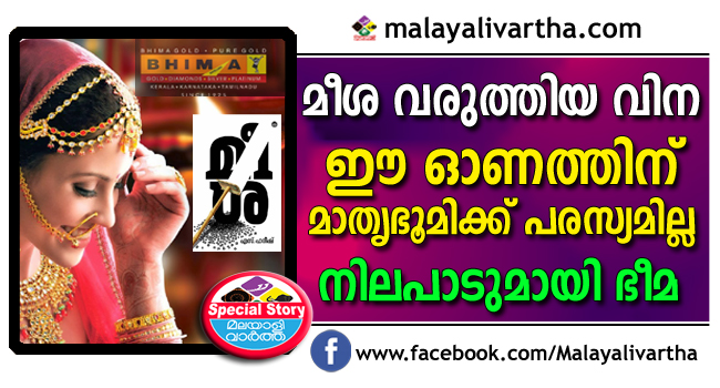 മീശയില് പ്രതിഷേധിച്ച് മാതൃഭൂമിയിലെ പരസ്യങ്ങള് നിര്ത്തുന്നുവെന്ന് ഭീമ; മാതൃഭൂമിക്ക് നഷ്ടമാകുന്നത് ലക്ഷങ്ങളുടെ ബിസിനസ്