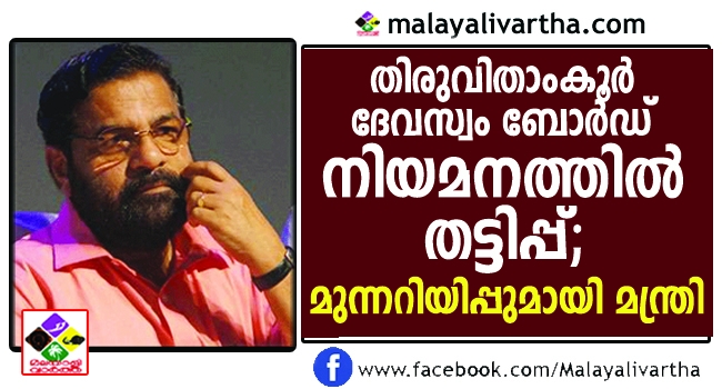 സംസ്ഥാനത്തെ 5 ദേവസ്വം ബോർഡുകളിലും നിയമനങ്ങൾ നടത്തുന്നത് കേരള ദേവസ്വം റിക്രൂട്ട്മെന്റ് ബോർഡാണ്. നിലവിൽ തിരുവിതാംകൂർ ദേവസ്വം ബോർഡിലെ എൽ. ഡി ക്ലാർക്ക്, സബ് ഗ്രൂപ്പ് ഓഫീസർ തസ്തികയിലേക്ക് അപേക്ഷ ക്ഷണിച്ച അവസരത്തിൽ ചില തല്പരകക്ഷികൾ തട്ടിപ്പിന് ശ്രമിക്കുന്നുവെന്നു സർക്കാരിന് വിവരം ലഭിച്ചതിന്റെ അടിസ്ഥാനത്തിൽ ദേവസ്വം മന്ത്രി കടകംപള്ളി സുരേന്ദ്രൻ തന്റെ ഫേസ്ബുക്ക് പോസ്റ്റിലൂടെ പൊതുജനങ്ങൾക്ക് മുന്നറിയിപ്പ് നൽകിയിരിക്കുകയാണ്. മാത്രവുമല്ല ഇതിനെതിരെ ശക്തമായ നടപടിയെടുക്കുമെന്നും അദ്ദേഹം ഉറപ്പു നൽകിയിട്ടുണ്ട്. ഫേസ്ബുക്ക് പോസ്റ്റിന്റെ പൂർണരൂപം ചുവടെ കൊടുക്കുന്നു.