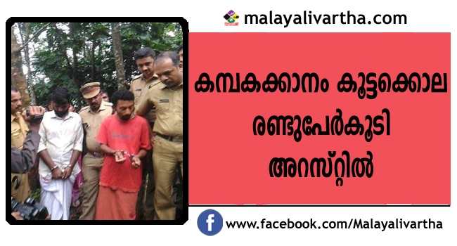 കമ്പകക്കാനം കൂട്ടക്കൊലക്കേസില് പിടിയിലായ ഒന്നും രണ്ടും പ്രതികളായ അനീഷിനെയും ലിബീഷിനെയും സഹായിച്ച രണ്ടുപേരെക്കൂടി പോലീസ് അറസ്റ്റുചെയ്തു. പ്രതികള്ക്ക് ഗ്ലൗസും മറ്റും വാങ്ങിക്കൊടുത്ത തൊടുപുഴ ആനക്കൂട് ചാത്തന്മല ഇലവുങ്കല് ശ്യാംപ്രസാദ് (28), അപഹരിച്ച സ്വര്ണം പണയം വയ്ക്കാന് സഹായിച്ച മൂവാറ്റുപുഴ വെള്ളൂര്കുന്നം പട്ടരുമഠത്തില് സനീഷ് (30) എന്നിവരെയാണ് അറസ്റ്റുചെയ്തത്. കൊലപാതകത്തിന് ഇരുവരെയും കൂടെക്കൂട്ടാന് മുഖ്യപ്രതികള് ശ്രമിച്ചെങ്കിലും ഇവര് കൂടെപ്പോകാന് തയാറായില്ല. എന്നാല് കൊലപാതകത്തെക്കുറിച്ച് വിവരമറിഞ്ഞിട്ടും പോലീസിനെ അറിയിക്കാത്തതിനും ഉപകരണങ്ങള് വാങ്ങിക്കൊടുത്തുസഹായിച്ചതിനുമാണ് ഇവരെ അറസ്റ്റുചെയ്തത്.