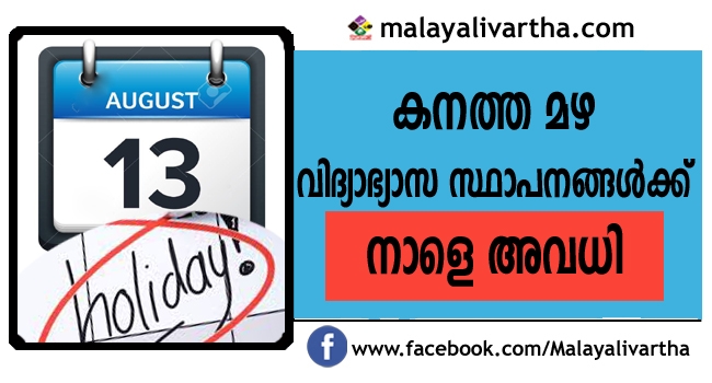 കനത്ത മഴ തുടരുന്നതിനാല് വിവിധ ജില്ലകളിലെ വിദ്യാഭ്യാസ സ്ഥാപനങ്ങള്ക്ക് നാളെ അവധി; ദുരിതാശ്വാസ ക്യാമ്പുകള് പ്രവര്ത്തിക്കുന്ന സ്കൂളുകള്ക്കും നാളെ അവധി