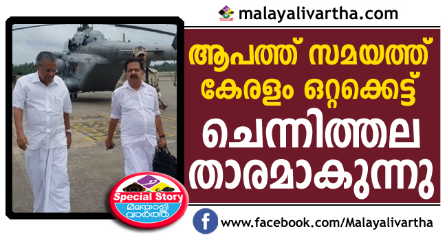 ആപത്ത് കാലത്ത് കേരളത്തിന് രാഷ്ട്രീയമില്ല ഒറ്റക്കെട്ടെന്ന് തെളിയിച്ചിരിക്കുകയാണ് പ്രതിപക്ഷ നേതാവ് രമേശ് ചെന്നിത്തല. രാഷ്ട്രീയം മറന്നു പ്രവര്ത്തിച്ച ചെന്നിത്തലയുടെ പോസ്റ്റും പ്രവര്ത്തികളും വൈറലാകുകയാണ്. മുഖ്യമന്ത്രിയോടൊപ്പം ദുരിതാശ്വാസ ക്യാംപുകളിലെത്തിയ ചെന്നിത്തല ഏറെ കൈയ്യടി നേടിയിരുന്നു. അതിന് പിന്നാലെ യുള്ള ചെന്നിത്തലയുടെ ഫേസ്ബക്ക് പോസ്റ്റും വൈറലായി.