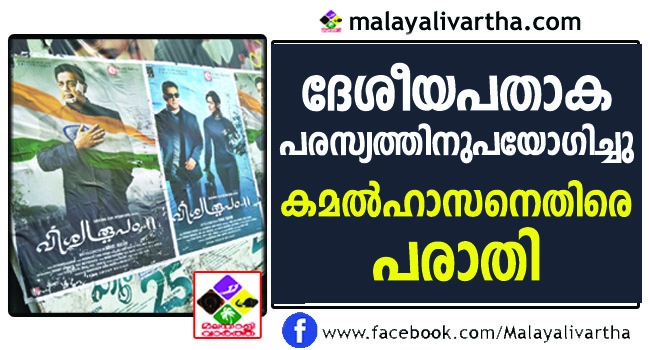വിശ്വരൂപം രണ്ടിന്റെ പ്രചരണത്തിനായി പോസ്റ്ററുകളില് ദേശീയപതാക ഉപയോഗിച്ച കമലാഹാസനെതിരെ പരാതി. സിനിമയ്ക്കും സിനിമാപ്രവര്ത്തകര്ക്കുമെതിരെ മഹാത്മാഗാന്ധി നാഷണല് ഫൗണ്ടേഷനാണ് പരാതി നല്കിയത്. ഫൗണ്ടേഷന് ചെയര്മാന് എബി ജെ. ജോസ് കേന്ദ്ര അഭ്യന്തരമന്ത്രാലയം, മുഖ്യമന്ത്രി, ഡിജിപി എന്നിവര്ക്ക് പരാതി നല്കി. സിനിമയുടെ പോസ്റ്ററില് കമല്ഹാസന് ദേശീയപതാക ആവരണമായി പുതച്ച നിലയിലാണ് ചിത്രീകരിച്ചിട്ടുള്ളത്. ദേശീയപതാക ഉപയോഗ ചട്ടമായ 2002ലെ ഫ്ലാഗ് കോഡ് ഓഫ് ഇന്ത്യ സെക്ഷന് അഞ്ച് വകുപ്പ് 3.28 പ്രകാരം ഇത് കുറ്റകരമാണ്.