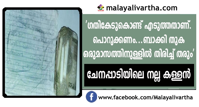 ചേനപ്പാടിയിലാണ് സംഭവം നടക്കുന്നത്. ബുധനാഴ്ച ഉച്ച സമയത്താണ് സുലൈമാന്റെ കടയില്നിന്നും 20000 രൂപയോളം നഷ്ടപെട്ടത്. വീട് സമീപത്തായതിനാല് കട പൂട്ടി ഭക്ഷണം കഴിയ്ക്കാന് പോയ സമയത്താണ് മോഷണം. ഒരു കെട്ടിടത്തില് തന്നെയാണ് പലചരക്ക് കടയും ചേര്ന്ന് കോഴിക്കടയും. കട പൂട്ടിയെങ്കിലും കോഴിക്കടയുടെ പിന്വശത്തെ ഗ്രില് പൂട്ടിയിരുന്നില്ല. ഇത് തുറന്ന് കടയ്ക്കുള്ളില് കയറിയാണ് മേശയ്ക്കുള്ളില്നിന്നും പണം കവര്ന്നത്. പണം നഷ്ടപെട്ടതിന്റെ മനോവിഷമവുമായാണ് ചേനപ്പാടി പുതുപ്പറമ്പില് സുലൈമാന് കഴിഞ്ഞദിവസം രാവിലെ കട തുറക്കാനെത്തിയത്. ഷട്ടര് തുറക്കുന്നതിനിടെ പുറം ഭിത്തിയുടെ മറവില് ഒരു പൊതി ശ്രദ്ധയില്പെട്ടു. ഒപ്പം ഒരു കുറിപ്പും. ആ കുറിപ്പില് ഇങ്ങനെ എഴുതിയിരുന്നു'ഗതികേടുകൊണ്ട് എടുത്തതാണ്. പൊറുക്കണം...ബാക്കി തുക ഒരുമാസത്തിനുള്ളില് തിരിച്ച് തരും'. പൊതിക്കുള്ളില് 9600 രൂപയും ഉണ്ടായിരുന്നു.