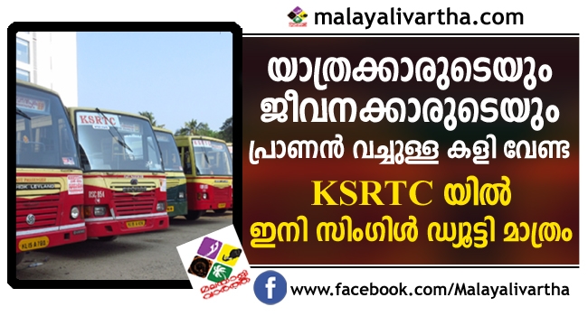 കെഎസ്ആര്ടിസിയില് സിംഗിള് ഡ്യൂട്ടി മാത്രമാക്കാന് തീരുമാനം... ഡബിള് ഡ്യൂട്ടി ചെയ്യുകയായിരുന്ന ബസ് ഡ്രൈവര് ഉറങ്ങിപ്പോയതിനാല് കൊല്ലം ഇത്തിക്കരയില് ഇന്നലെ എക്സ്പ്രസ് ലോറിയിലിടിച്ച് അപകടമുണ്ടായ പശ്ചാത്തലത്തിലാണ് അടിയന്തര നടപടി
