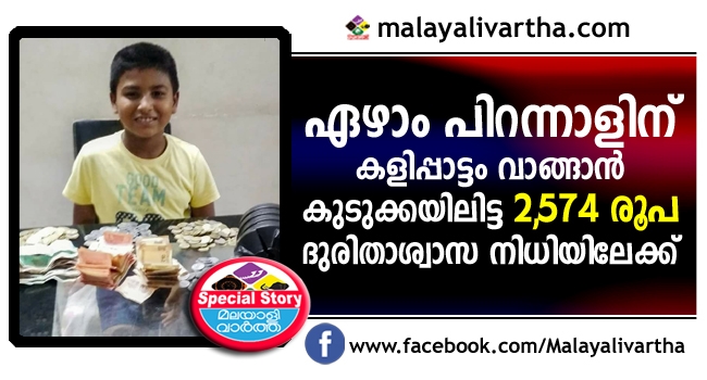 പിറന്നാള് ദിനത്തില് ഇഷ്ടപ്പെട്ട കളിപ്പാട്ടം വാങ്ങാന് കുടുക്കയില് സൂക്ഷിച്ചിരുന്ന 2,574 രൂപ ഷെല്ഡന് എന്ന കുരുന്ന് മുഖ്യമന്ത്രിയുടെ ദുരിതാശ്വാസനിധിയിലേക്ക് നല്കി