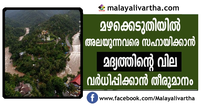 കേരളം നേരിടുന്ന അതിഗുരുതരമായ വെള്ളപ്പൊക്കം നേരിടുന്നതിനാവശ്യമായ പണം കണ്ടെത്തുന്നതിന് മദ്യത്തിന്റെ വില കൂട്ടാന് തീരുമാനം. നാശനഷ്ടങ്ങള് നികത്തുന്നതിനും ദുരിതബാധിതര്ക്ക് സഹായം എത്തിക്കുന്നതിനും പൊതുജനങ്ങളില്നിന്ന് പണം സമാഹരിക്കുന്നുണ്ടെങ്കിലും അത് പര്യാപ്തമാകാത്ത സാഹചര്യത്തിലാണ് മദ്യത്തിന്റെ വില വര്ധിപ്പിക്കാന് മന്ത്രിസഭാ യോഗത്തില് ധാരണയിലെത്തിയത്.