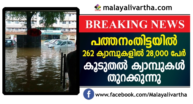 പ്രളയക്കെടുതിയെ തുടര്ന്ന് പത്തനംതിട്ട ജില്ലയില് 262 ദുരിതാശ്വാസ ക്യാമ്പുകളിലായി 28000ത്തോളം പേര് കഴിയുന്നുണ്ടെന്ന് മുഖ്യമന്ത്രിയുടെ ഓഫീസ് അറിയിച്ചു. കോഴഞ്ചേരി , തിരുവല്ല താലൂക്കുകളില് കൂടുതല് ആളുകളെ ഒഴിപ്പിക്കുന്നതിന് അനുസരിച്ച് പുതിയ ക്യാമ്പുകള് തുറന്ന് വരികയാണ്. തിരുവല്ലയില് 141 ക്യാമ്പുകളും കോഴഞ്ചേരിയില് 42 ഉം റാന്നിയില് 15 ഉം മല്ലപ്പള്ളിയില് 24 ഉം കോന്നിയില് 23 ഉം അടൂരില് 17 ഉം ക്യാമ്പുകള് പ്രവര്ത്തിക്കുന്നു. ഇതിന് പുറമേ ബോട്ടുകളിലും വ്യോമമാര്ഗവും ആളുകളെ ഒഴിപ്പിക്കുന്നതിന് അനുസരിച്ച് തിരുവല്ല കോഴഞ്ചേരി താലൂക്കുകളിലെ ഉയര്ന്ന സ്ഥലങ്ങളില് കൂടുതല് ക്യാമ്പുകള് തുറന്ന് വരുന്നു.