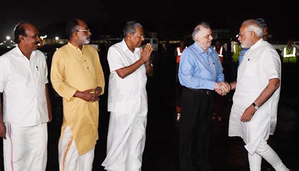 കേരളത്തെ ബാധിച്ച പ്രളയം കണ്ടറിയാന് പ്രധാനമന്ത്രി നരേന്ദ്രമോദി തിരുവനന്തപുരത്തെത്തി. ഇന്നു രാവിലെ 6.50ന് രാജ്ഭവനില് നിന്ന് പുറപ്പെടുന്ന അദ്ദേഹം 7.30ന് കൊച്ചിയിലെത്തി. എറണാകുളം ജില്ലയിലെ ആലുവ, അങ്കമാലി ആലപ്പുഴ ജില്ലയിലെ ചെങ്ങന്നൂര്, പത്തനംതിട്ടയിലെ റാന്നി എന്നിവിടങ്ങളിലെ വിവിധ ദുരിതബാധിത പ്രദേശങ്ങള് അദ്ദേഹം സന്ദര്ശിക്കും. തുടര്ന്ന് ആലപ്പുഴയിലോ കൊച്ചിയിലോ അദ്ദേഹം മുഖ്യമന്ത്രി പിണറായി വിജയനുമായി ചര്ച്ച നടത്തുമെന്നാണ് പുറത്തുവരുന്ന റിപ്പോര്ട്ടുകള്. നിരവധിപ്പേരുടെ ജീവനെടുത്ത് ദിവസങ്ങളായി തുടരുന്ന പ്രളയം ദേശീയ ദുരന്തമായി പ്രഖ്യാപിക്കണമെന്ന സര്ക്കാരിന്റെയും പ്രതിപക്ഷത്തിന്റെയും അടക്കമുള്ള ആവശ്യങ്ങള് നിലനില്ക്കുന്നതിനിടെയാണ് നിര്ണായകമായ വ്യോമനിരീക്ഷണം റദ്ദാക്കിയിരിക്കുന്നത്. കൊച്ചി നാവിക ആസ്ഥാനത്ത് തുടരുന്ന പ്രധാനമന്ത്രി കാലാവസ്ഥ അനുകൂലമായ ശേഷം വ്യോമനിരീക്ഷണം നടത്തുമോ എന്ന വിവരം ലഭ്യമല്ല. മുഖ്യമന്ത്രി പിണറായി വിജയന് റവന്യു മന്ത്രി ഇ.ചന്ദ്രശേഖരന് തുടങ്ങിയവരും പ്രധാനമന്ത്രിയെ അനുഗമിക്കുന്നുണ്ട്. ഇപ്പോള് പ്രധാനമന്ത്രിയും മുഖ്യമന്ത്രിയും ഗവര്ണര് പി.സദാശിവവും തമ്മില് നാവികസേനാ ആസ്ഥാനത്തെ ഓഫീസില് ചര്ച്ച നടത്തുകയാണ്. ഇതിനു ശേഷമേ മറ്റ് നടപടികള് അറിയാനാകൂ