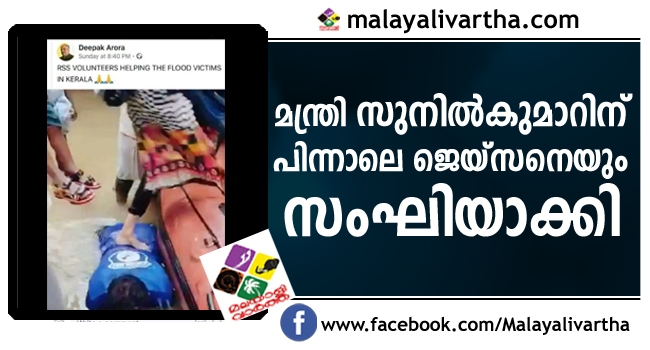 കൃഷിമന്ത്രി വി.എസ് സുനില്കുമാറും ഡി.ജി.പി ലോക്നാഥ് ബെഹ്റയും ദുരിതാശ്വാസപ്രവര്ത്തനങ്ങള് നടത്തുന്നതിന്റെ ചിത്രം ആര്.എസ്.എസ് കാര്യവാഹാക്കി പ്രചരണം നടത്തിയത് വിവാദമായതിന് പിന്നാലെയാണ് അറോറ എന്നയാള് ജെയ്സനെയും സംഘിയാക്കിയത്. പിന്നീട് ഈ പോസ്റ്റ് ഡിലീറ്റ് ചെയ്തു.