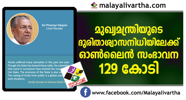 മുഖ്യമന്ത്രിയുടെ ദുരിതാശ്വാസനിധിയിലേക്ക് ഓണ്ലൈന് വഴി 129 കോടി ലഭിച്ചു, ആകെ ബാങ്കിലെത്തിയത് 388 കോടി