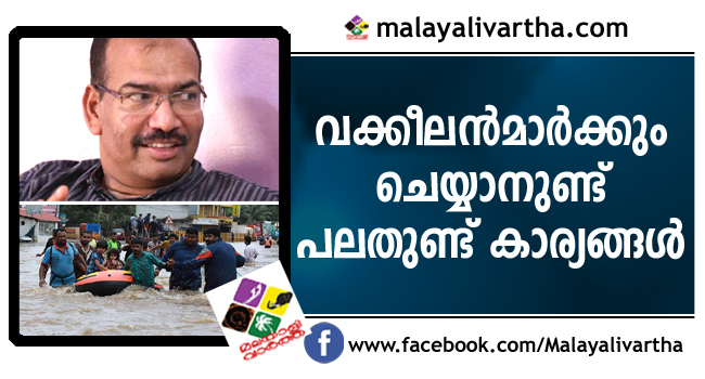 സമൂഹത്തിലെ എല്ലാ വിഭാഗത്തിലുമുള്ള ആളുകള് ഈ പ്രളയ കാലത്ത് ഒറ്റക്കെട്ടായി ദുരിതത്തില് അകപ്പെട്ടവരെ രക്ഷിക്കാന് തയ്യാറായി. വക്കീലന്മാരും (ജഡ്ജിമാര് ഉള്പ്പടെ) വ്യത്യസ്തമായിരുന്നില്ല. കോടതികളും ബാര് അസോസിയേഷനും ആസ്ഥാനമാക്കി അവരും രക്ഷാ പ്രവര്ത്തനത്തിനും ദുരിതാശ്വാസത്തിനും ഇറങ്ങി. ഇപ്പോഴും തുടരുന്നു.