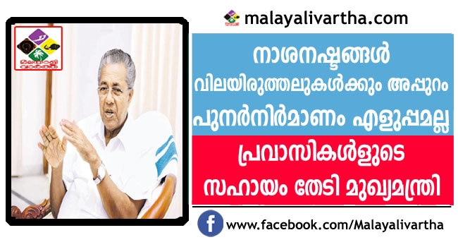 സംസ്ഥാനത്തുണ്ടായ നാശനഷ്ടങ്ങള് പ്രാഥമികരമായി വിലയിരുത്തിയതിലും അധികം; പുനര്നിര്മാണം എളുപ്പമുള്ള കാര്യമല്ല; എന്നാല് നാം ഒന്നിച്ചുനിന്ന് അതിനെ നേരിടും; പ്രവാസികള് ഒരുമാസത്തെ ശമ്പളം ദുരിതാശ്വാസ പ്രവര്ത്തനങ്ങള്ക്കായി സംഭാവന ചെയ്യണമെന്ന് അഭ്യര്ഥിച്ച് മുഖ്യമന്ത്രി