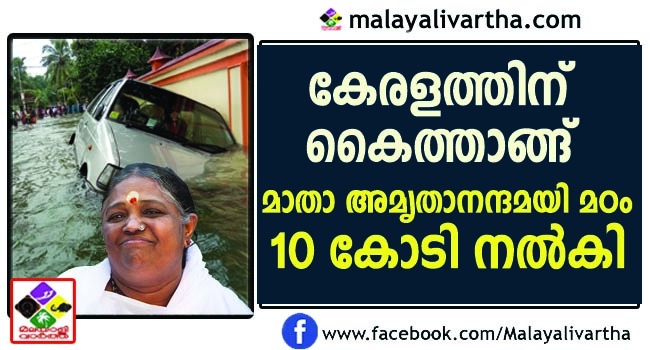 പ്രളയക്കെടുതിയിൽ ദുരിതം അനുഭവിക്കുന്ന അകേരളത്തിന് കൈത്താങ്ങായി മാതാ അമൃതാനന്ദമയി മഠത്തിന്റെ 10 കോടി രൂപ. മുഖ്യമന്ത്രിയുടെ ദുരിതാശ്വാസ നിധിയിലേക്കു മഠം വൈസ് ചെയർമാൻ സ്വാമി അമൃതസ്വരൂപാനന്ദ പുരി തുക കൈമാറി.