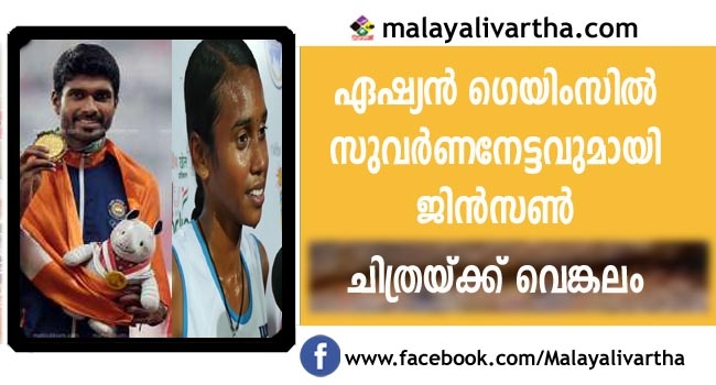 ഏഷ്യന് ഗെയിംസില് മലയാളിപ്പെരുമ 1500 മീറ്റര് ഓട്ടത്തില് ജിന്സണ് ജോണ്സണ് സ്വര്ണം; പി.യു. ചിത്രക്ക് വെങ്കലം