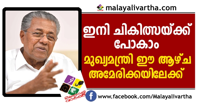 സോട്ടയിലെ റോചെസ്റ്ററില് പ്രവര്ത്തിക്കുന്ന മയോ ക്ലിനിക്കിലാണ് മുഖ്യമന്ത്രി ചികിത്സ തേടുന്നത്. ന്യൂറോളജി, കാന്സര്, ഹൃദയസംബന്ധമായ രോഗങ്ങളുടെ ചികിത്സയ്ക്ക് പ്രശസ്തമാണ് മയോ ക്ലിനിക്. 17 ദിവസത്തെ ചികിത്സയ്ക്കാണ് അദ്ദേഹം പുറപ്പെടുക. ഓഗസ്റ്റ് പത്തൊമ്പതിന് പുറപ്പെട്ട് സെപ്റ്റംബര് ആറിന് തിരിച്ചെത്താനായിരുന്നു ആദ്യതീരുമാനം. മുഖ്യമന്ത്രിയുടെ ചികിത്സയുടെ പൂർണ ചെലവ് സംസ്ഥാന സര്ക്കാർ വഹിക്കും. ഭാര്യ കമലാ വിജയനും മുഖ്യമന്ത്രിക്കൊപ്പമുണ്ടാകും.