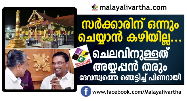 ദേവസ്വം ബോര്ഡിന്റെ കൈയില് നിക്ഷേപമായി ഉള്ള 1200 കോടിയോളം രൂപ ഉപയോഗിച്ച് നിര്മ്മാണ പ്രവര്ത്തനങ്ങള് നടത്താന് മുഖ്യമന്ത്രി നിര്ദ്ദേശിച്ചു. എന്നാല്, ജീവനക്കാരുടെ ശമ്ബളം, വിരമിച്ച ജീവനക്കാരുടെ പെന്ഷന് ഇവയൊക്കെ നല്കേണ്ടി വരുന്നതിനാല് ആ തുക ബോര്ഡിന് ആവശ്യമാണെന്ന് പത്മകുമാര് പറഞ്ഞു. തല്ക്കാലം സര്ക്കാരിന് ഒന്നും ചെയ്യാന് കഴിയില്ല. അക്കൗണ്ടില് ഉള്ളതെടുത്ത് പുനര് നിര്മ്മാണം നടത്തുക. ബാക്കി ചെലവിനുള്ളത് അയ്യപ്പന് തരും എന്നായിരുന്നു പിണറായിയുടെ മറുപടി.