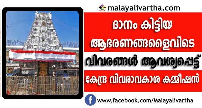 തിരുപ്പതി ക്ഷേത്രത്തിന് ദാനം കിട്ടിയ ആഭരണങ്ങളുടെ വിവരങ്ങള് ആവശ്യപ്പെട്ട് കേന്ദ്ര വിവരാവകാശ കമ്മീഷന്; രാജാവ് കൃഷ്ണ ദേവരായര് ദാനം നല്കിയ ആഭരണങ്ങള് ഒന്നും തന്നെ ഇന്ന് ക്ഷേത്രത്തില് ഇല്ല