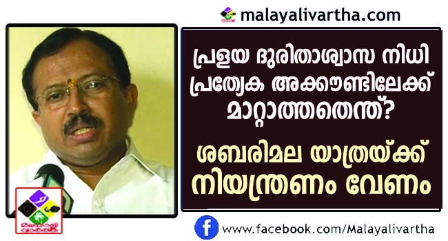 പ്രളയത്തിന് ശേഷമുള്ള പുനരുദ്ധാരണ പ്രവര്ത്തനങ്ങള് നടക്കുമ്പോള് വിഭവസമാഹരണത്തിനെന്ന പേരിലുള്ള മന്ത്രിമാരുടെ വിദേശയാത്ര അനാവശ്യമാണെന്ന് വി മുരളീധരന് എംപി ആരോപിച്ചു. പ്രളയ ദുരിതാശ്വാസ നിധി പ്രത്യേക അക്കൗണ്ടിലേക്ക് മാറ്റാന് അനുവദിക്കാത്തത് എന്തുകൊണ്ടാണെന്നും അദ്ദേഹം ചോദിച്ചു. നിലവിലെ സാഹചര്യത്തില് ശബരിമലയിലെ തീര്ത്ഥാടനത്തിന് നിയന്ത്രണം ആവശ്യമാണ്. കസ്തൂരിരംഗന് റിപ്പോര്ട്ടിനെക്കുറിച്ച് സംസ്ഥാനം പുനര്ചിന്തനം നടത്തേണ്ടത് അനിവാര്യമായിരിക്കുന്നുവെന്നും അദ്ദേഹം പറഞ്ഞു.