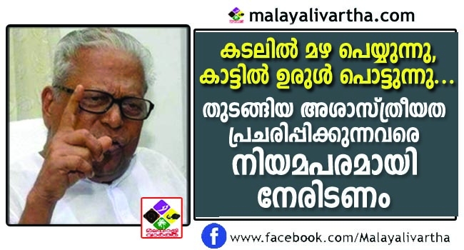 കടലില് മഴ പെയ്യുന്നത് കാടുള്ളതുകൊണ്ടല്ല, കാട്ടില് ഉരുള് പൊട്ടുന്നത് പാറമടകൊണ്ടല്ല, തുടങ്ങിയ കുയുക്തികള് നിരത്തി അശാസ്ത്രീയത പ്രചരിപ്പിക്കുന്ന മാഫിയകളെ നിയമപരമായി നേരിടണമെന്ന് മുന്മുഖ്യമന്ത്രി വി.എസ് അച്യുതാനന്ദന് ആവശ്യപ്പെട്ടു. സ്വതവേ ഉരുള് പൊട്ടുന്ന സ്വഭാവമുള്ള ഭൂപ്രദേശമാണ് മലനാട്. അത്തരം ഭൂമിയില് കുന്നിടിക്കുന്നതും പാറമടകള് നടത്തുന്നതും ന്യായീകരിക്കാനാവില്ലെന്നും അദ്ദേഹം പറഞ്ഞു. ഇടത് എം.എല്.എമാരായ പി.വി അന്വര്, തോമസ് ചാണ്ടി, രാജേന്ദ്രന് എന്നിവരാണ് പ്രളയം ചര്ച്ച ചെയ്യാന് വിളിച്ച് ചേര്ത്ത പ്രത്യേക നിയമസഭാ സമ്മേളനത്തില് ഇക്കാര്യങ്ങള് ചൂണ്ടിക്കാട്ടിയത്. പിണറായി വിജയനുമായി ഏറെ അടുപ്പമുള്ള ഇൗ എം.എല്.എമാര്ക്കെതിരെയാണ് വി.എസിന്റെ ഒളിയമ്പ്.