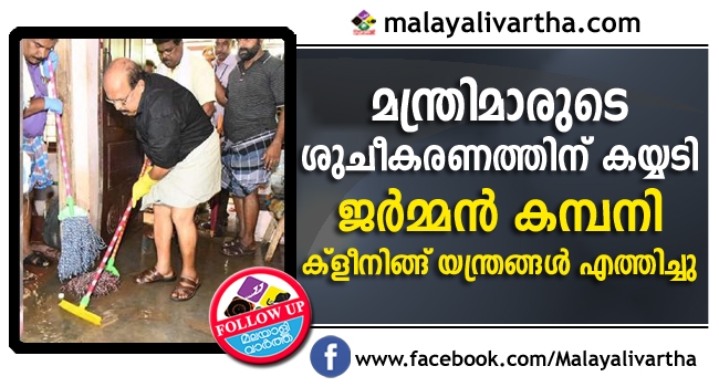 മന്ത്രിമാരായ ജി.സുധാകരനും തോമസ് ഐസക്കും പി.തിലോത്തമനും പ്രളയബാധിത പ്രദേശങ്ങളില് ശുചീകരണം നടത്തുന്നത് കണ്ട് ജര്മന് കമ്പനി ക്ലീനിംഗ് യന്ത്രങ്ങള് സൗജന്യമായി എത്തിച്ചു
