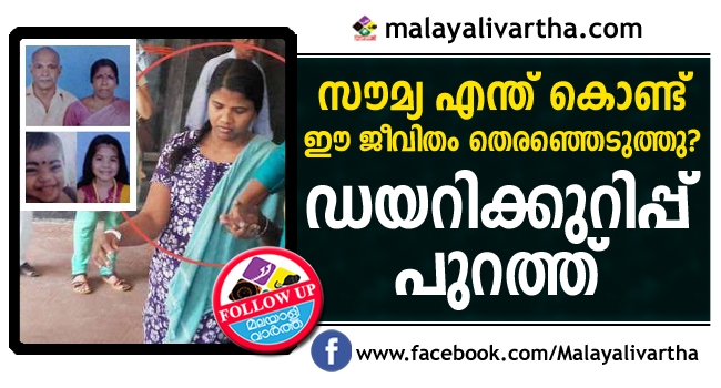 മാതാപിതാക്കളെയും മകളെയും വിഷം കൊടുത്തു കൊലപ്പെടുത്തിയ സംഭവത്തിൽ ജയിലിൽ കഴിയവേ ആത്മഹത്യ ചെയ്ത പ്രതി സൗമ്യയുടെ ജയില് ഡയറിക്കുറിപ്പിന്റെ കൂടുതല് വിശദാംശങ്ങള് പുറത്ത്. തന്നെ വഴിതെറ്റിച്ച പ്രദേശവാസിയുടെ പേര് സൗമ്യ ആറ് സ്ഥലത്താണ് ഡയറിയില് എഴുതി വച്ചിരിക്കുന്നത്. ഡയറിയിലെ വിവാദ ഭാഗങ്ങളെപ്പറ്റി അന്വേഷണം നടത്താന് കണ്ണൂര് സിഐ കുറിപ്പ് കൈമാറിയിട്ടും എങ്ങുമെത്താത്ത അവസ്ഥയിലാണ് അന്വേഷണം എത്തി നില്ക്കുന്നത്.