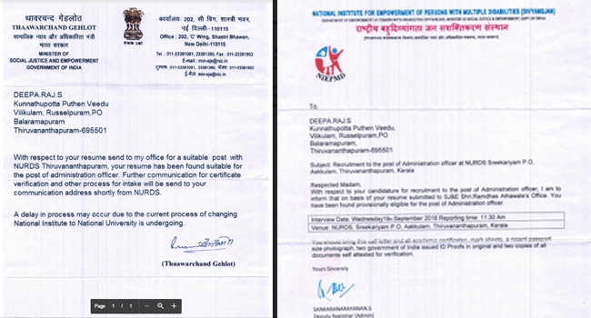 ബാലരാമപുരം റസല്പുരം സ്വദേശിനിയ്ക്ക് അഡ്മിനിസ്ട്രേഷന് ഓഫീസര് തസ്തികയില് ബുധനാഴ്ച 11.30ന് ആക്കുളത്തെ എന്.യു.ആര്.ഡി.എസ്. ഓഫീസില് വച്ച് ഇന്റര്വ്യൂനായി, എന്.ഐ.ഇ.പി.എം.ഡി.യില് നിന്നും ലെറ്റര് ലഭിച്ചത്. ഇതോടൊപ്പം കേന്ദ്ര മന്ത്രിയുടെ ശിപാര്ശ കത്തും ലഭിച്ചതോടെ യുവതി വിശ്വസിച്ചു. എന്നാല് ഇന്റര്വ്യൂവിനായി സ്ഥലത്തെത്തിയതോടെയാണ് ഇങ്ങനെയൊരു സ്ഥാപനം ഇല്ലെന്ന് യുവതിയ്ക്ക് മനസിലായത്. ആ സ്ഥലത്ത് പ്രവര്ത്തിക്കുന്നത് നിഷാണ്. നിഷിനെ കേന്ദ്ര സര്ക്കാര് ഏറ്റെടുക്കുമ്പോഴുള്ള പേരാണ് എന്.യു.ആര്.ഡി.എസ്. ഇതോടെയാണ് യുവതി കബളിക്കപ്പെട്ടെന്ന് മനസിലായത്.
