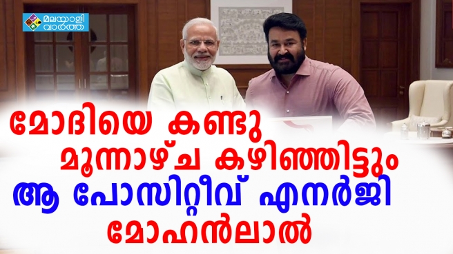 മോദിയെ പുകഴ്തി മോഹന്ലാല്; പ്രധാനമന്ത്രി നരേന്ദ്ര മോദിയെ കണ്ടു മൂന്നാഴ്ച കഴിഞ്ഞിട്ടും പോസിറ്റീവ് എനര്ജി ബാക്കിനില്ക്കുന്നുവെന്നു മോഹന്ലാല്; ഏതു വലിയ മനുഷ്യരുടെ അടുത്തുനിന്നാലും സൂക്ഷ്മമായി നിരീക്ഷിച്ചാല് ഒരു പോസിറ്റീവ് എനര്ജി അനുഭവപ്പെടുമെന്നും മോഹന്ലാല്