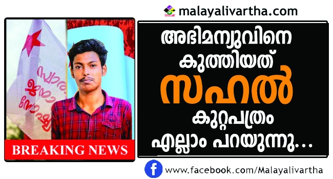മഹാരാജാസിലെ എസ്എഫ്ഐ നേതാവ് അഭിമന്യുവിനെ കുത്തി കൊലപ്പെടുത്തിയത് സഹല് (21) എന്ന ക്യാമ്പസ് ഫ്രണ്ട് പ്രവര്ത്തകനാണെന്ന് അന്വേഷണ സംഘം. എറണാകുളം ജുഡീഷ്യല് ഫസ്റ്റ് ക്ലാസ് രണ്ടാം കോടതിയില് കണ്ട്രോള് റൂം എ.സി.പി സമര്പ്പിച്ച കുറ്റപത്രത്തിലാണ് ഇക്കാര്യം വ്യക്തമാക്കുന്നത്. കേസില് നേരിട്ട് പങ്കാളികളായ ക്യാമ്പസ് ഫ്രണ്ട്, എസ്ഡിപിഐ, പോപ്പുലര് ഫ്രണ്ട് പ്രവര്ത്തകരായ 16 പേര്ക്കെതിരെയാണ് ആദ്യഘട്ടത്തില് കേസെടുത്തത്. ആയിരത്തി അഞ്ഞൂറോളം പേജുള്ള കുറ്റപത്രത്തിലാണ് അഭിമന്യുവിനെ കുത്തിയത് മരട് നെട്ടൂര് മസ്ജിദ് റോഡില് മേക്കാട്ട് സഹല് ആണെന്ന് വ്യക്തമാക്കുന്നത്. ഇയാള്ക്കായി ലുക്ക്ഔട്ട് നോട്ടീസ് പുറപ്പെടുവിച്ചിട്ടുണ്ട്.