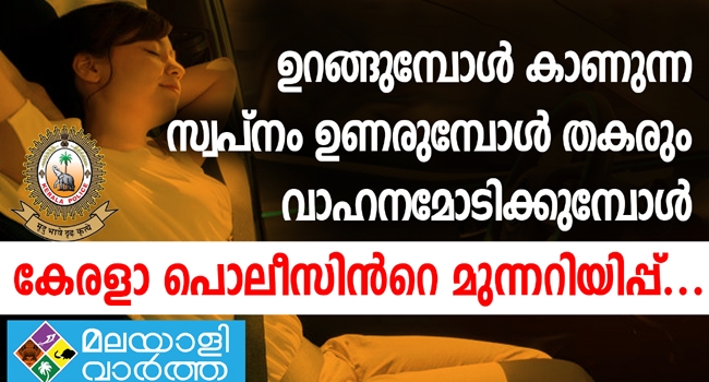ഉറങ്ങുമ്പോൾ കാണുന്ന സ്വപ്നം ഉണരുമ്പോൾ തകരും ; കുടുംബാംഗങ്ങൾ ഒന്നിച്ചു മരണപ്പെടുകയോ അപകടത്തിലാവുകയോ ചെയ്യുന്ന മിക്ക അപകടങ്ങളുമുണ്ടാകുന്നത് രാത്രിയിൽ; വാഹനമോടിക്കുമ്പോള് ശ്രദ്ധിക്കണം; കേരളാ പൊലീസിന്റെ മുന്നറിയിപ്പ്