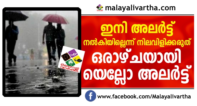 ഇന്ന് പത്തനംതിട്ട, കോട്ടയം, എറണാകുളം, ഇടുക്കി, പാലക്കാട്, വയനാട് ജില്ലകളിലും 28-ന് എറണാകുളം, ഇടുക്കി, കോഴിക്കോട്, പാലക്കാട്, വയനാട് എന്നീ ജില്ലകളിലും 29 ന് ഇടുക്കി, പാലക്കാട്, മലപ്പുറം എന്നീ ജില്ലകളിലും 30-ന് പത്തനംതിട്ട, ഇടുക്കി, മലപ്പുറം, കോഴിക്കോട് എന്നീ ജില്ലകളിലുമാണ് യെല്ലോ അലേര്ട്ട് പ്രഖ്യാപിച്ചിട്ടുള്ളത്.