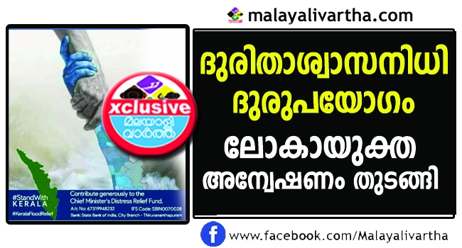 ദുരിതാശ്വാസനിധിയുടെ ദുര്വിനിയോഗം ചെയ്തെന്ന കേസില് ലോകായുക്ത അന്വേഷണം തുടങ്ങി. മുഖ്യമന്ത്രിയെയും മന്ത്രിമാരെയും എതിര്കക്ഷികളാക്കി മുന് കേരള സര്വ്വകലാശാല സിന്ഡികേറ്റ് അംഗം ആര്.എസ് ശശികുമാര് നല്കിയ പരാതിയിലാണ് ലോകായുക്ത പ്രാഥമിക അന്യഷണം തുടങ്ങിയത്. ഇതിന്റെ ഭാഗമായി ദുരിതാശ്വാസ നിധിയില് നിന്നും തുക അനുവദിക്കുന്നത് സംബന്ധിച്ച് നിലവിലുള്ള എല്ലാ ഉത്തരവുകളും , സ്കീമുകളും ഹാജരാക്കുവാന് ചീഫ് സെക്രട്ടറിക്ക് സമന്സ് അയക്കുവാന് ലോകായുക്ത ജസ്റ്റീസ് പയസ് സി കുര്യാക്കോസ് ഉപലോകായുക്ത ജസ്റ്റീസ് എ.കെ ബഷീര് എന്നിവരടങ്ങിയ ഡിവിഷന് ബെഞ്ച് ഉത്തരവിട്ടു .