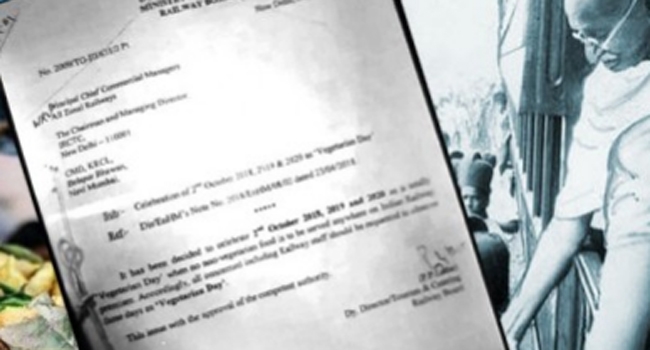 ഗാന്ധിജയന്തിയുടെ മറവില് ഇത്തരത്തിലൊരു നടപടി ചരിത്രത്തിലാദ്യമായിരുന്നു. ഈ വര്ഷവും 2019-2020 വര്ഷങ്ങളിലും ഒക്ടോബര് രണ്ടിന് സസ്യ ഭക്ഷണം മാത്രമേ ട്രെയിനില് വിളമ്പാവൂ എന്നും ഉത്തരവിലുണ്ടായിരുന്നു.റെയില്വേയിലെ ഭക്ഷണ വിതരണ ചുമതലയുള്ള ഐആര്സിടിസിയ്ക്കും എല്ലാ റെയില്വേ മേഖലാ പ്രിന്സിപ്പല് ചീഫ് കൊമേഴ്സ്യല് മാനേജര്മാര്ക്കും ഉത്തരവ് കൈമാറിയിരുന്നു.
