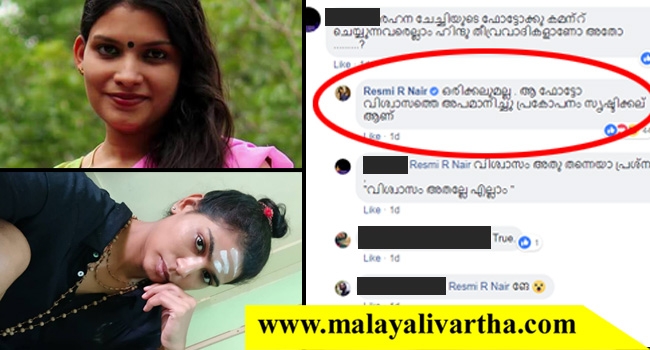 എന്നാൽ കാര്യങ്ങൾ ഇങ്ങനെ ആണെങ്കിലും ഇപ്പോൾ രഹ്ന ഫാത്തിമയുടെ ചിത്രത്തെ വിമര്ശിച്ച് രശ്മി നായരും രംഗത്തെയിരിക്കുകയാണ്. വിശ്വാസത്തിനു മുകളില് കയറി കോപ്രായം കാണിക്കരുതെന്നാണ് രശ്മി ആഞ്ഞടിച്ചത്. വിശ്വാസത്തെ അപമാനിച്ച് പ്രകോപനം സൃഷ്ടിക്കുന്നതാണ് ഈ ചിത്രം എന്നാണ് ഒരു കമന്റിന് മറുപടിയായി രശ്മി കുറിച്ചത്.