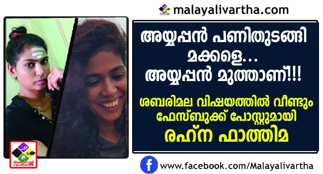അയ്യപ്പൻ പണിതുടങ്ങി മക്കളെ... അയ്യപ്പൻ മുത്താണ്!! ; ജോലിയിൽ എനിക്ക് ജീവിതത്തിൽ ഏറ്റവും ആഗ്രഹിച്ച പ്രമോഷൻ കിട്ടി; ഇനി നിങ്ങൾ പറ ഞാൻ ശബരിമല കയറണോ വേണ്ടയോ?; ശബരിമലവിഷയത്തിൽ വീണ്ടും ഫേസ്ബുക്ക് പോസ്റ്റുമായി രഹ്ന ഫാത്തിമ