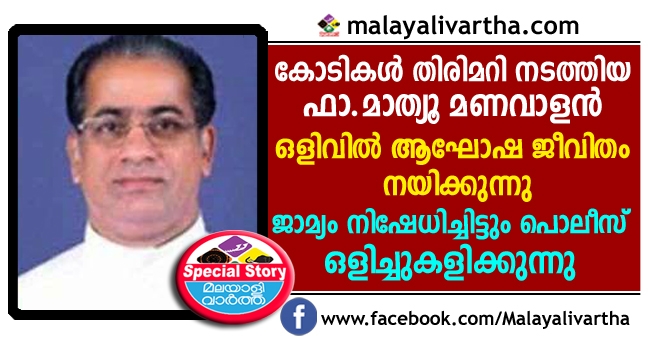 23 കോടിയുടെ തട്ടിപ്പ് നടത്തിയ മുന് കൊരട്ടി പള്ളി വികാരി മാത്യു മണവാളന് ഒളിവില് ആഘോഷജീവിതം നയിക്കുകയാണെന്നും ഇദ്ദേഹത്തിന് മുന്കൂര് ജാമ്യം നിഷേധിച്ചിട്ടും പൊലീസ് ഒളിച്ചുകളിക്കുകയാണെന്നും വിശ്വാസികള് ആരോപിക്കുന്നു. ഇതേക്കുറിച്ച് പരാതിപ്പെടാനെത്തിയ വിശ്വാസികളെ ഉന്നത പൊലീസ് ഉദ്യോഗസ്ഥര് പരിഹസിച്ച് ഇറക്കിവിട്ടെന്നും ആക്ഷേപം. ഒരു കൂട്ടം വിശ്വാസികളുടെ ഫെയിസ്ബുക്ക് പേജായ പാവം കുഞ്ഞാടിലാണ് ഇത് സംബന്ധിച്ച വിവരങ്ങള് വന്നത്.