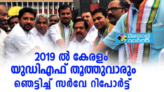 എബിപി-വോട്ടര് സര്വെ പ്രകാരം 2019 ലോക്സഭാ തെരെഞ്ഞെടുപ്പില് കേരളം കോണ്ഗ്രസ് നേതൃത്വത്തിലുള്ള യുഡിഎഫ് തൂത്തുവാരും. ആകെയുള്ള 20 സീറ്റില് 16 സീറ്റും യുഡിഎഫ് നേടുമ്പോള് എല്ഡിഎഫിന് ലഭിക്കുക 4 സീറ്റുകള് മാത്രമാണ്. ബിജെപിക്ക് ഒരു സീറ്റുപോലും ലഭിക്കില്ലെന്ന് സര്വെ വ്യക്തമാക്കുന്നു. നിലവില് 12 സീറ്റ് യൂഡിഎഫ് സിറ്റിങ്ങ് സീറ്റാണ്. ഇതിന് പുറമേ എല്ഡിഎഫിന്റെ നാല് സീറ്റുകള് കൂടി യുഡിഎഫ് പിടിച്ചെടുക്കും. ബിജെപി മികച്ച പ്രകടനം കാഴ്ച്ചവെക്കുമെങ്കിലും ഒരു സീറ്റില്പോലും വിജയിക്കാന് കഴിയില്ലെന്നും സര്വെയില് പറയുന്നു.