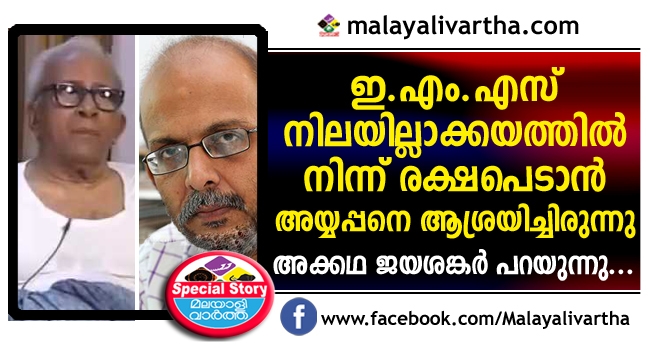 വിമോചന സമരകാലത്ത് ആദ്യത്തെ കമ്മ്യൂണിസ്റ്റ് സര്ക്കാര് നിലയില്ലാക്കയത്തില് മുങ്ങിത്താണപ്പോള് മുഖ്യമന്ത്രിയായിരുന്ന ഇ.എം.എസ് അയ്യപ്പനെ കൂട്ടുപിടിച്ച് ഭരണം നിലനിര്ത്താന് നടത്തിയ ശ്രമം ചീറ്റിപ്പോയിരുന്നു. അക്കഥ അഡ്വ. ജയശങ്കര് കമ്മ്യൂണിസ്റ്റ് ഭരണവും വിമോചന സമരവും എന്ന പുസ്തകത്തില് വിശദീകരിക്കുന്നുണ്ട്. ശബരിമല സ്ത്രീ പ്രവേശനം സുപ്രീംകോടതി വിധിച്ചപ്പോള് മറ്റൊരു കമ്യൂണിസ്റ്റ് സര്ക്കാരിന് തലവേദന സൃഷ്ടിക്കുന്നതിനിടയിലാണ് പഴയ സംഭവം പറയുന്നത്.
