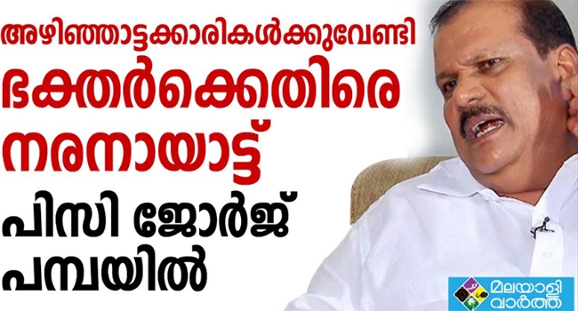 അഞ്ചോ ആറോ അഴിഞ്ഞാട്ടക്കാരികള്ക്കു വേണ്ടി ഭക്തരായ കോടിക്കണക്കിനു ആളുകളെ തല്ലിച്ചതക്കുന്നതാണോ മര്യാദ; അയ്യപ്പന് എന്നത് ഒരു അന്ധവിശ്വാസമാണെന്നു വരുത്തി തീര്ക്കാനുള്ള തത്രപ്പാടിലാണ് നിരീശ്വര വാദികളായ കമ്യൂണിസ്റ്റുകാര് എന്ന് പിസി ജോര്ജ്ജ്