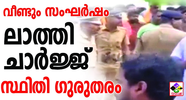 ബസുകളില് നിന്ന് യുവതികളേയും വനിതാ പോലീസ് ഉദ്യോഗസ്ഥരേയും സമരക്കാര് ഇറക്കി വിടുന്നുണ്ടായിരുന്നു. പരിക്കേറ്റ വനിതാ മാധ്യമപ്രവര്ത്തകരെ ആശുപത്രിയില് എത്തിക്കാനെത്തിയ പോലീസ് വാഹനത്തിന് നേരെ കല്ലേറുമുണ്ടായി. ഇതോടെയാണ് പോലീസ് ലാത്തി വീശിയത്. പോലീസ് വാഹനത്തിന്റെ ചില്ലുകള് തകര്ന്നു. ലാത്തിച്ചാര്ജിനിടെയും പോലീസിന് നേരെ കല്ലേറുണ്ടായി. എഡിജിപി ഉള്പ്പെടെയുള്ളവര്ക്ക് പരിക്കേറ്റു.