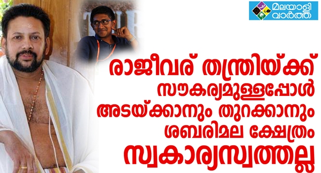 അങ്ങേയ്ക്ക് സൗകര്യമുള്ളപ്പോ അടയ്ക്കാനും തുറക്കാനും ശബരിമല ക്ഷേത്രം താഴമൺ കുടുംബത്തിന്റെ സ്വകാര്യസ്വത്തല്ല. ഊരായ്മ തന്ത്രി സ്ഥാനമേ താഴമണ്ണിനുള്ളൂ. അത് മാറ്റാൻ പാടില്ലെന്ന് തന്ത്രവിധിയൊന്നുമില്ലല്ലോ. തന്നിഷ്ടം പോലെ ചെയ്യുന്ന തന്ത്രിയെ മാറ്റാൻ വിശ്വാസികൾ ദേവസ്വം ബോർഡിലും കോടതിയിലും നല്ലൊരു നീക്കം നടത്തിയാൽ, അങ്ങേയ്ക്ക് ആ കൃഷി ഓഫീസിലെ പഴയജോലി കൊണ്ട് ഇനിയങ്ങോട്ട് കഴിയേണ്ടി വരും. തന്ത്രി പണി ചെയ്യാൻ താഴമൺ കുടുംബത്ത് വേറെ കൊള്ളാവുന്ന 'പുരുഷ'ന്മാരുണ്ടോ ആവോ !