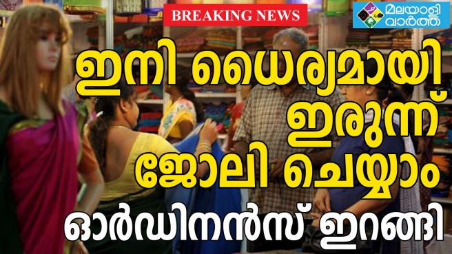 വസ്ത്രവ്യാപാര സ്ഥാപനങ്ങളിലടക്കം സ്ത്രീകള്ക്ക് ഇനി ധൈര്യമായി ഇരുന്ന് ജോലി ചെയ്യാം. ഇത് സംബന്ധിച്ച ഓര്ഡിനന്സ് സര്ക്കാര് പുറത്തിറക്കി. സ്ത്രീതൊഴിലാളികളുടെ അന്തസ്സും സുരക്ഷിതത്വവും ഉറപ്പുവരുത്തിയും ജോലിക്കിടയില് ഇരിക്കാന് അവകാശം നല്കിയുമാണ് കേരള കടകളും വാണിജ്യസ്ഥാപനങ്ങളും നിയമത്തില് സംസ്ഥാന സര്ക്കാര് സുപ്രധാന ഭേദഗതികള് വരുത്തിയത്. ഇതുസംബന്ധിച്ച് ഗവര്ണര് ഓര്ഡിനന്സ് പുറപ്പെടുവിച്ചു. 1960ലെ കേരള കടകളും വാണിജ്യസ്ഥാപനങ്ങളും ആക്ടില് തൊഴിലാളികള്ക്കനുകൂലമായ ഭേദഗതികള് വരുത്താനുള്ള ബില്ലിന്റെ അടിയന്തരപ്രാധാന്യം കണക്കിലെടുത്താണ് ഗവര്ണര് ഇതുസംബന്ധിച്ച ഓര്ഡിനന്സ് പുറപ്പെടുവിച്ചത്.