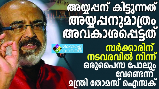 നടവരവില് നിന്ന് ഒരു നയാപൈസപോലും സര്ക്കാര് ആവശ്യങ്ങള്ക്ക് ചെലവാക്കുന്നില്ല ;അയ്യപ്പന് കിട്ടുന്നത് അയ്യപ്പന് മാത്രം അവകാശപ്പെട്ടത് ; നിലപാട് വ്യക്തമാക്കി മന്ത്രി തോമസ് ഐസ്ക്ക്