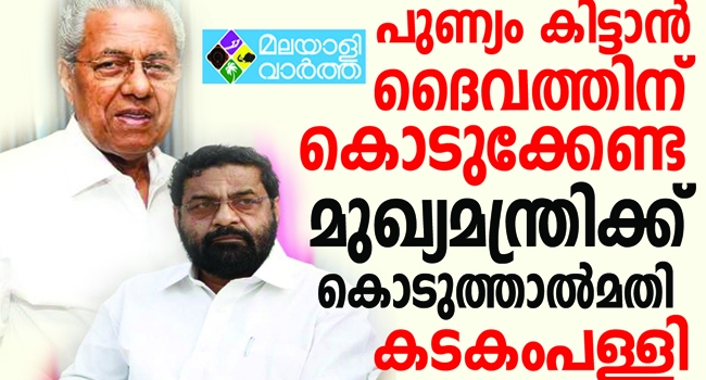 പുണ്യം കിട്ടാന് ഭണ്ഡാരത്തില് ഇടുന്നതിനു പകരം മുഖ്യമന്ത്രിയുടെ ദുരിതാശ്വാസ നിധിയിലേക്ക് നല്കണമെന്നു മന്ത്രി കടകംപള്ളി സുരേന്ദ്രന്. കാട്ടാക്കട അസി.രജിസ്ട്രാര് ഓഫീസ് ഉദ്ഘാടന ചടങ്ങിലാണ് മന്ത്രിയുടെ ഈ പ്രസ്താവന. പുണ്യം ആഗ്രഹിക്കുന്നവരാണ് നമ്മള്. നന്മ നിറഞ്ഞ പ്രവൃത്തിയിലൂടെയോ ഇതു നേടാനാവൂ, നന്മയുള്ള പ്രവൃത്തി നടക്കുന്നിടത്ത് ഈശ്വര സാന്നിധ്യമുണ്ടാകും.