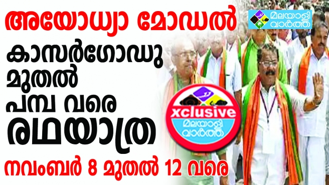 അയോധ്യ മോഡല് രഥയാത്രക്കൊരുങ്ങി ബി.ജെ.പി സോമനാഥ ക്ഷേത്രത്തില് നിന്നും അയോധ്യയിലേക്ക് എല്.കെ. അദ്വാനി നടത്തിയ രഥയാത്രയ്ക്കു സമാനമായി കേരളത്തിലും രഥയാത്രയുമായി ബി.ജെ.പി. പി.എസ്. ശ്രീധരന് പിള്ളയും, തുഷാര് വെള്ളാപ്പള്ളിയും ചേര്ന്നു നയിക്കുന്ന യാത്ര കാസര്ഗോഡ് മധൂര് ഗണപതി ക്ഷേത്രത്തില് നിന്നും പമ്പയിലേക്കാണ്. നവംബര് എട്ടാം തീയതി മുതല് 12-ാം തീയതി വരെയാണ് രഥയാത്ര.