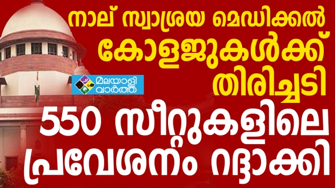 അടിസ്ഥാന സൗകര്യങ്ങളില്ലാതെ മെഡിക്കല് പ്രവേശനം നടത്തിയ നാല് സാശ്രയ മെഡിക്കല് കോളജുകളിലെ 550 സീറ്റുകള് സുപ്രീംകോടതി റദ്ദാക്കി, മുമ്പ് കണ്ണൂര്, കരുണ മെഡിക്കല് കോളജുകളിലെ 180 സീറ്റുകളിലെ പ്രവേശനം റദ്ദാക്കിയിരുന്നു