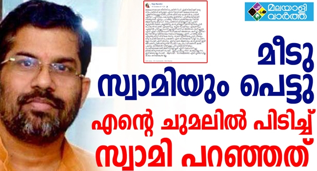 സ്വാമി വലിയ മഹാനാണെന്നു കരുതി കാലില് വീഴുന്ന പലരും ഉള്ളതുകൊണ്ടാണ് ഇക്കാര്യം ആരോടും പറയാതിരുന്നതെന്നും എന്നാല് ഇപ്പോ മീടൂവിന്റെ കാലമല്ലേ എന്നു ചോദിച്ചുകൊണ്ടാണ് ഒക്ടോബര് 16ന് എഴുതിയ പോസ്റ്റ് അവസാനിപ്പിക്കുന്നത്.