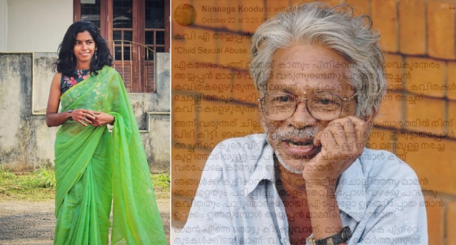 പത്താം വയസില് തനിക്ക് അയ്യപ്പനില് നിന്നും ലൈഗീകാതിക്രമം നേരിട്ടെന്നും അന്ന് ഞാന് ശ്വാസം അടക്കി അനങ്ങാതെ കിടന്നെന്നും എന്നാല് പിന് കഴുത്തിലെ ആ പൊള്ളല് ഇതെഴുതുമ്പോഴും വന്നെന്നും നിംനഗ കൂടു എന്ന യുവതി ഫേസ്ബുക്കിലിട്ട കുറിപ്പില് പറയുന്നു. അതേസമയം ലോകത്തെ വീടാക്കിയ നിഷ്കളങ്കനായ കുട്ടി എന്ന് വിളിപ്പേരുള്ള അയ്യപ്പനെതിരെ ഉയര്ന്നിരിക്കുന്ന ഈ ആരോപണം ഉള്ക്കൊള്ളാനാവാതെ വിഷമിക്കുകയാണ് ഇപ്പോഴും കവിയുടെ ആരാധകര്.